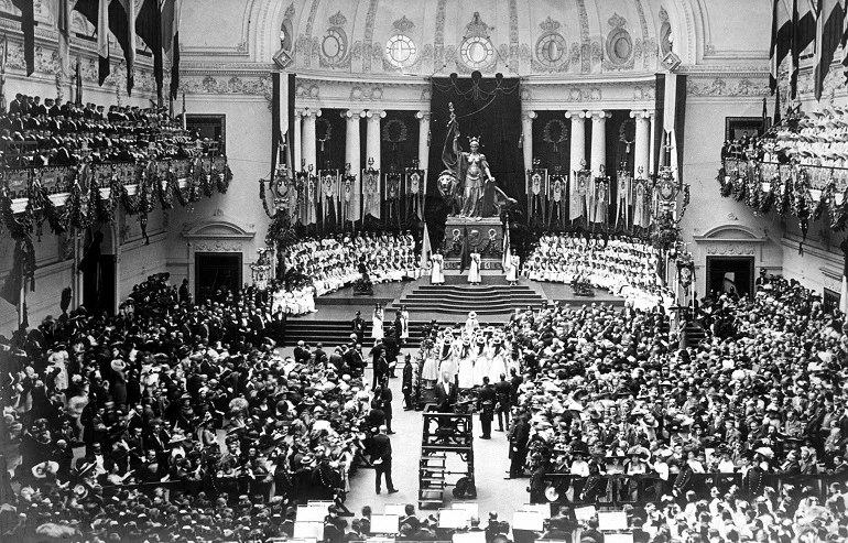 Kunst- en handelsverenigingen vragen een grote tentoonstellingshal. De Meir wordt hertekend; de stad plant een monumentale feestzaal.